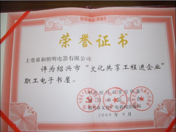 The day March 19, was a day to celebrate. Shang Yu Shun He Electric Appliance for Illumination Co. LTD was given an honor ¡°The Sharing of Culture Project into Enterprise¡± by Shao Xing General Labor Union. As it made our employees easily share much excellent culture information resource.