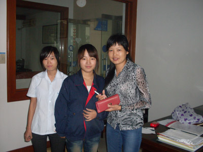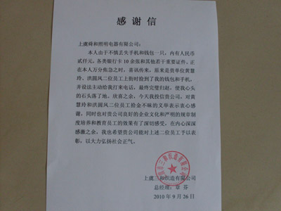 On September 24,our workshop workers Huang Huiling and Hong Yuanfeng picked up a purse outside the factory.There were a mobile phone¡¢10 bank cards¡¢some important credentials and cash of RMB 2000.00 in the purse.After picking up the purse,Huang and Hong refered it to the workshop manager and contacted the loser immediately,and finally the loser got her purse with many thanks.For their great action and great spirit of returning money,our factory awarded praise to them two,so as to encourage standing up for what is right and carry on the fine general mood of society!