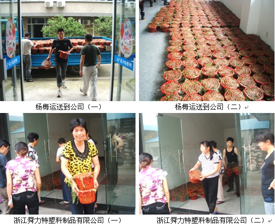 公司感谢大家炎炎夏日中的辛勤付出,6月29日至7月2日公司组织发放杨梅活动,全体员工每人一筐,其中包括: “浙江舜力特塑料制品有限公司” 、 “百年春国际娱乐会所”、“上虞舜和照明电器有限公司”以及“你我照明有限公司”四个公司。