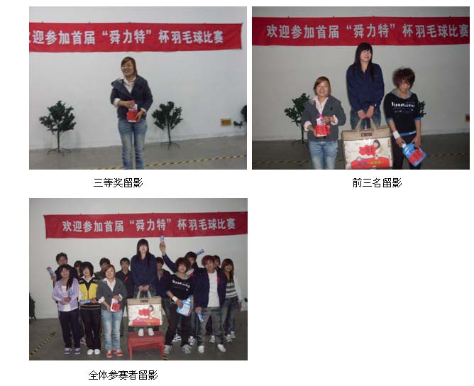 4月16日企管部组织了“舜力特”杯羽毛球比赛,通过参赛选手们紧张、激烈的比拼,最后决出本届比赛的前三名选手,发放奖品表示祝贺,并为所有参赛者发放纪念奖表示鼓励!