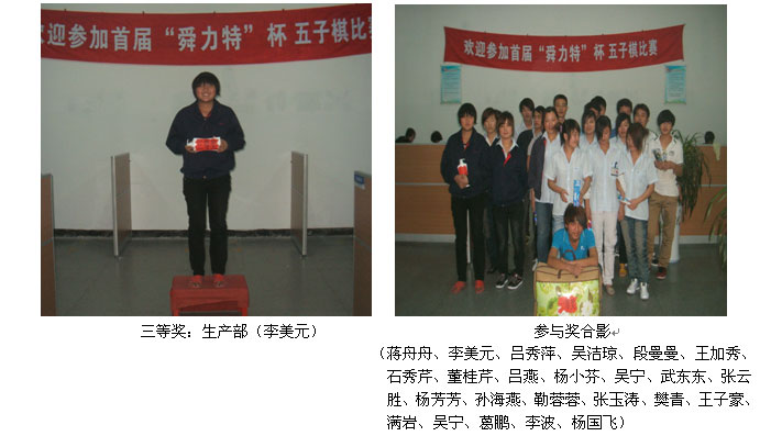 为了丰富员工业余生活,提高员工自身体质,从4月份起企管部组织每月2次员工比赛活动。5月14日企管部组织了“舜力特”杯五子棋比赛,通过参赛选手们紧张、激烈的比拼,最后决出本届比赛的前三名选手,发放奖品表示祝贺,并为所有参赛者发放纪念奖表示鼓励!