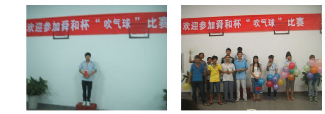 为了丰富员工业余生活,提高员工自身体质,从4月份起企管部组织每月2次员工比赛活动。7月15日企管部组织了“舜和”杯吹气球比赛,通过参赛选手们紧张、激烈的比拼,最后决出本届比赛的前三名选手,发放奖品表示祝贺,并为所有参赛者发放纪念奖表示鼓励!