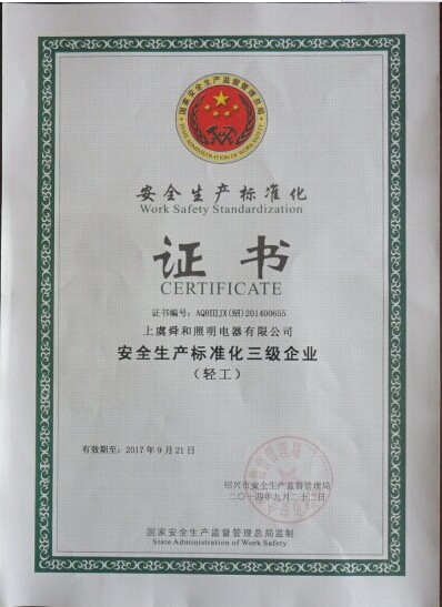 在2014年8月中旬,公司顺利通过绍兴市安全生产标准化三级企业验收,这是对我们公司安全生产管理工作的肯定,我们会一如既往把这项工作踏实地维护和改进,争取做得更好。
