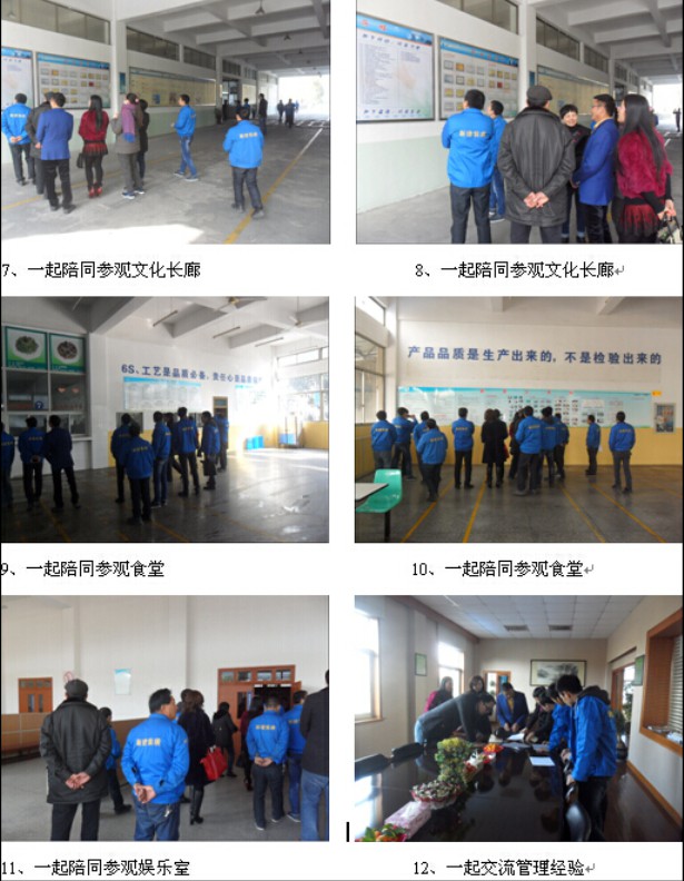 在1月10日下午,兄弟单位来我们公司交流企业管理经验,公司组织安排参观了生产车间、仓库、文化长廊、员工娱乐室以及食堂、员工宿舍等,对我们公司全面而精细管理得到一致好评,然后大家一起坐下来相互交流心得,取长补短,大家都感到非常满意,收获甚大。