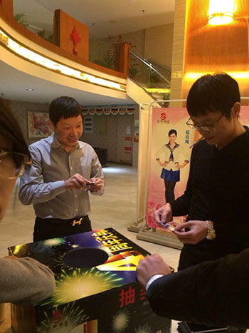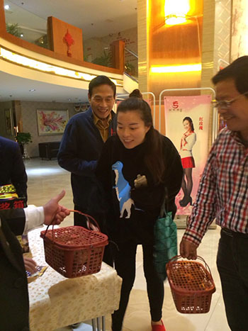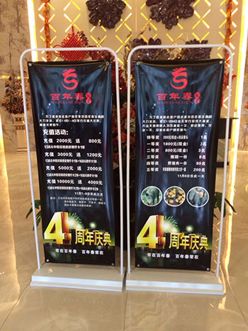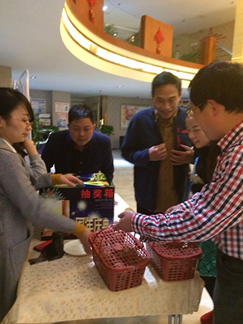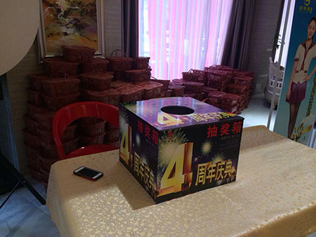 11月8日,舜和公司下属百年春足道举行4周年店庆,公司安排了丰富多彩的节目,其中抽奖特别受客户欢迎,奖品全部是本公司农场自己种养的番薯、马铃薯、大白猪肉等,图片是店庆现场抽奖和领奖的喜庆场面。