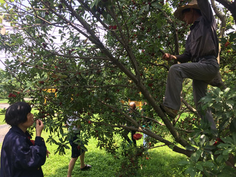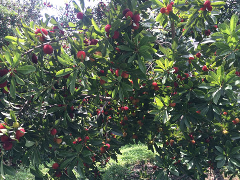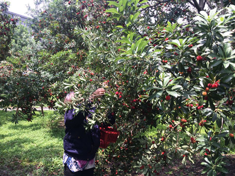 今年杨梅又是大丰收,看照片果实累累,红彤彤的一片,公司内共有三十多颗大杨梅树,图片上正在采摘,然后全部分给员工品尝。