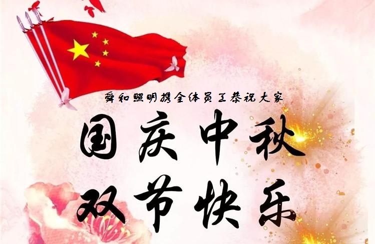 热烈庆祝中华人民共和国成立71周年,今年恰逢国庆中秋双节同庆,舜和照明携全体员工祝大家双节快乐!